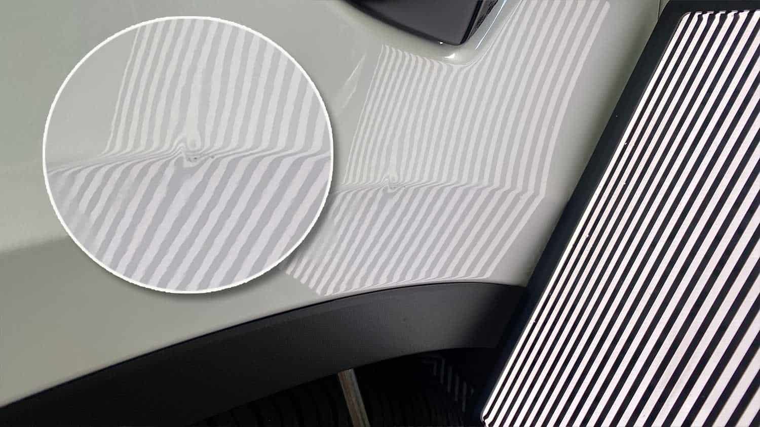 Let’s talk about the most common Tesla repair I see: a door ding on the body line of a Model 3 front door.